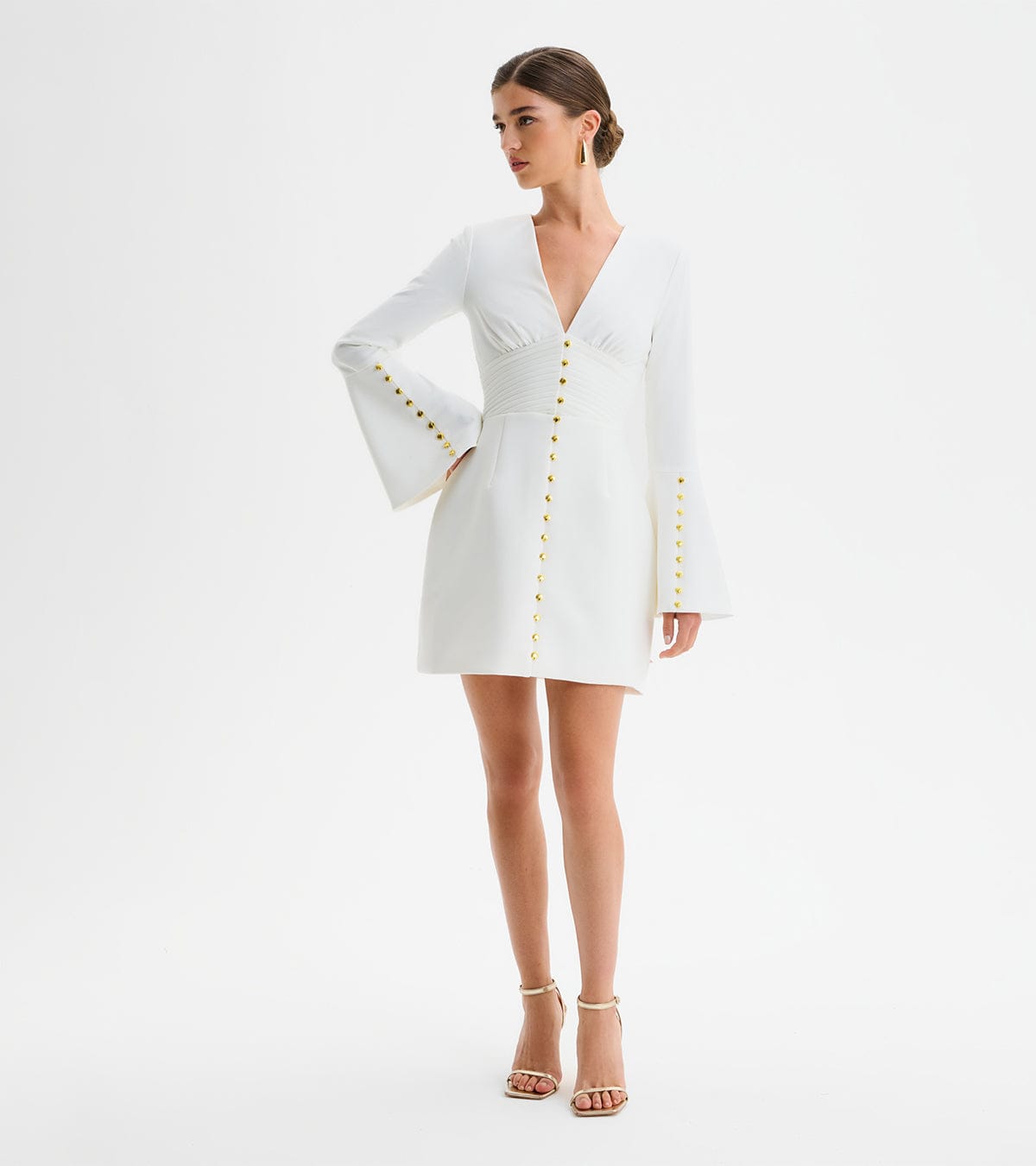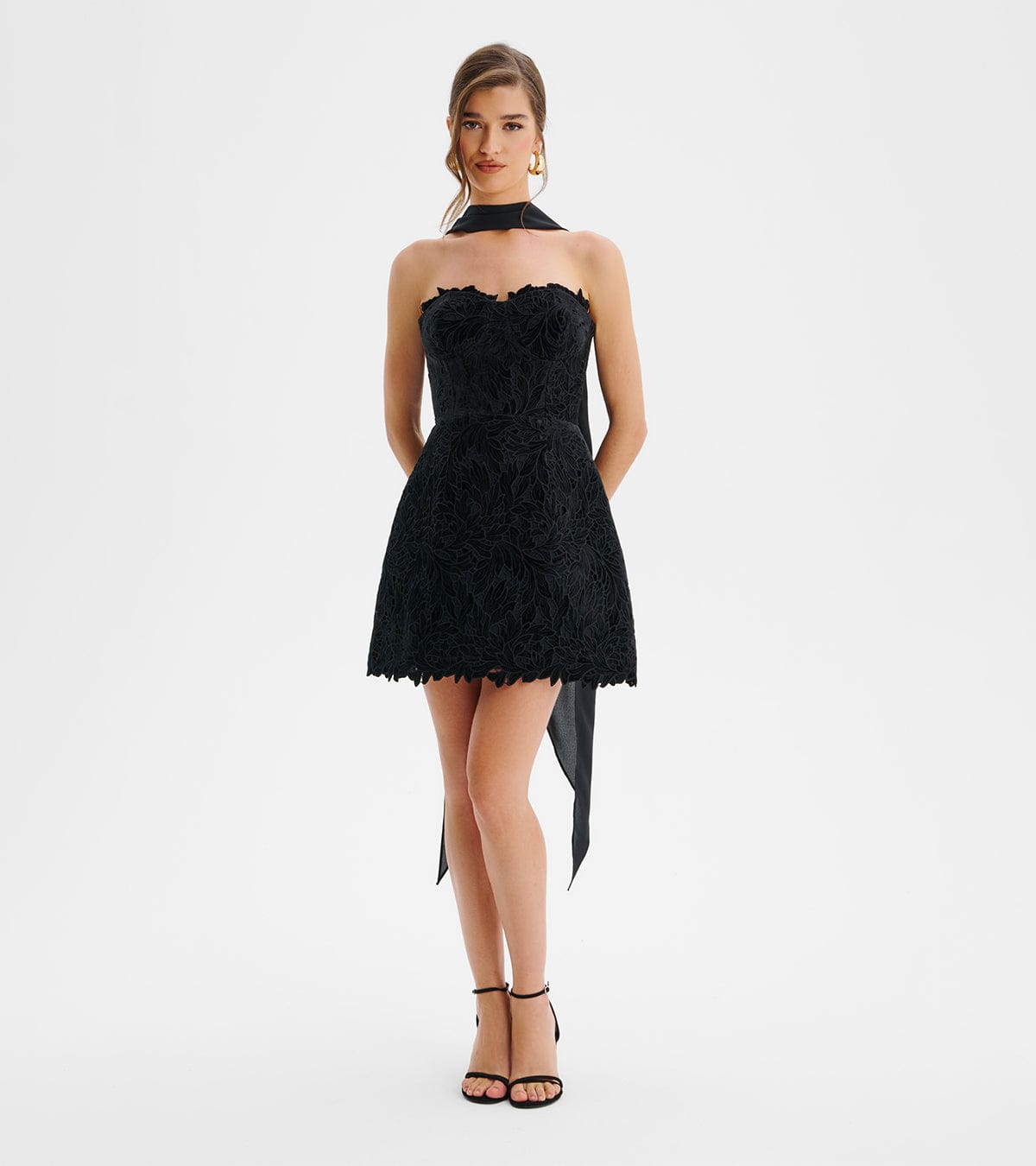 Make an unforgettable entrance in our CARA Micro Button and Loop Detail Volume Flared Mini Dress, expertly crafted in stunning floral broderie. The dress cascades into a flared, full mini skirt with gathered detailing, creating playful yet sophisticated movement with every step. Its halter neck design is beautifully complemented by a deep V-neckline, framed with exquisite loop trim and self-fabric covered buttons, adding a refined touch. Perfect for garden parties, weddings, or dreamy destinations, this dress effortlessly blends chic femininity with timeless glamour, ensuring you leave a lasting impression wherever you go.